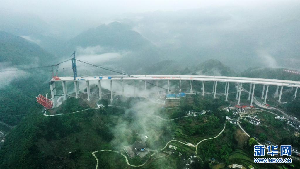 这是4月22日拍摄的贵州省仁遵高速公路大发渠特大桥施工现场(无人机照片)。