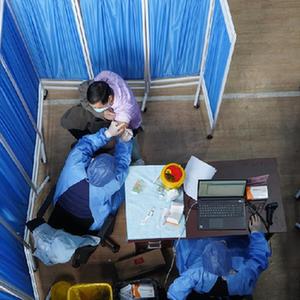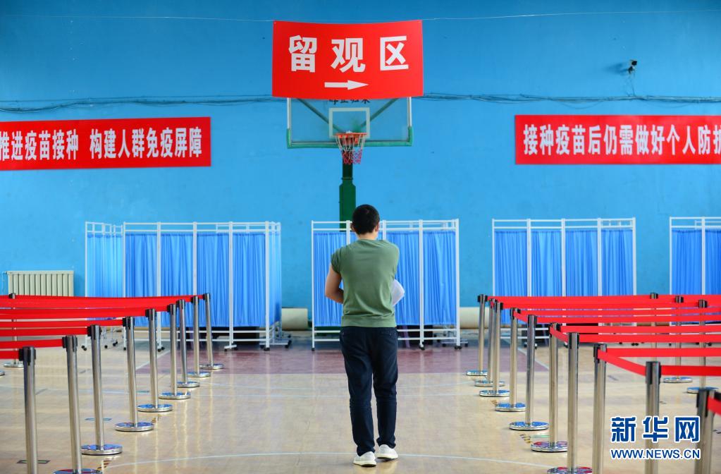4月22日,在石家庄鹿泉区获鹿镇新冠疫苗临时接种点,一名居民完成新冠疫苗接种后前往留观区。