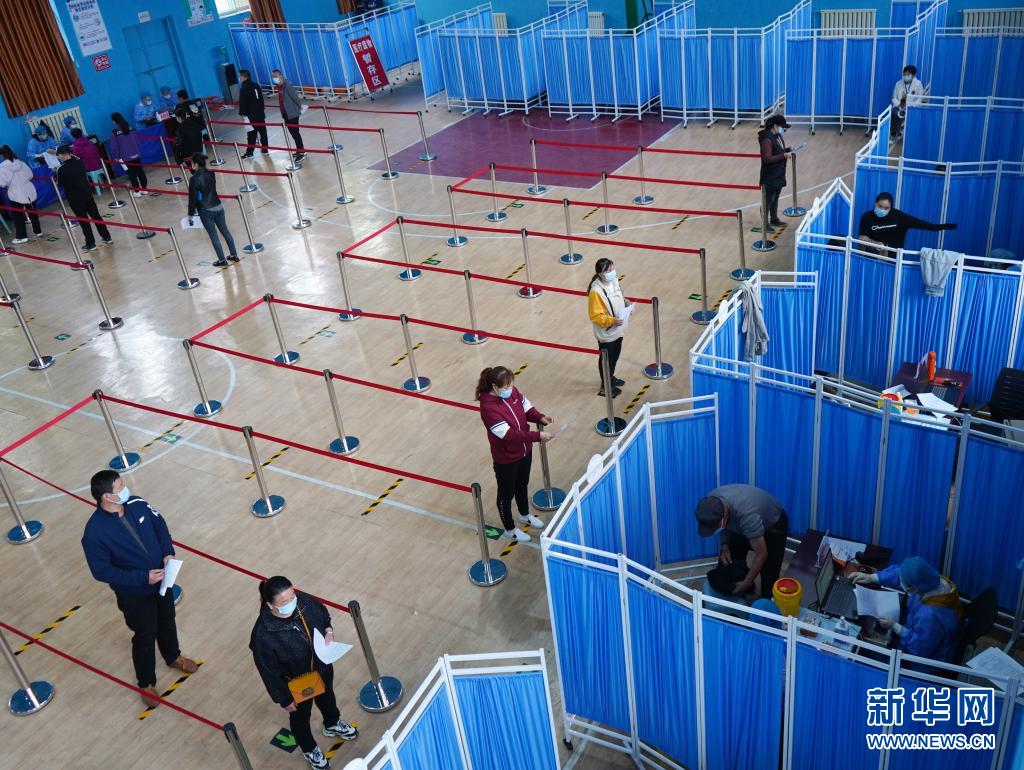 4月22日,在石家庄鹿泉区获鹿镇新冠疫苗临时接种点,居民在排队等待接种新冠疫苗。