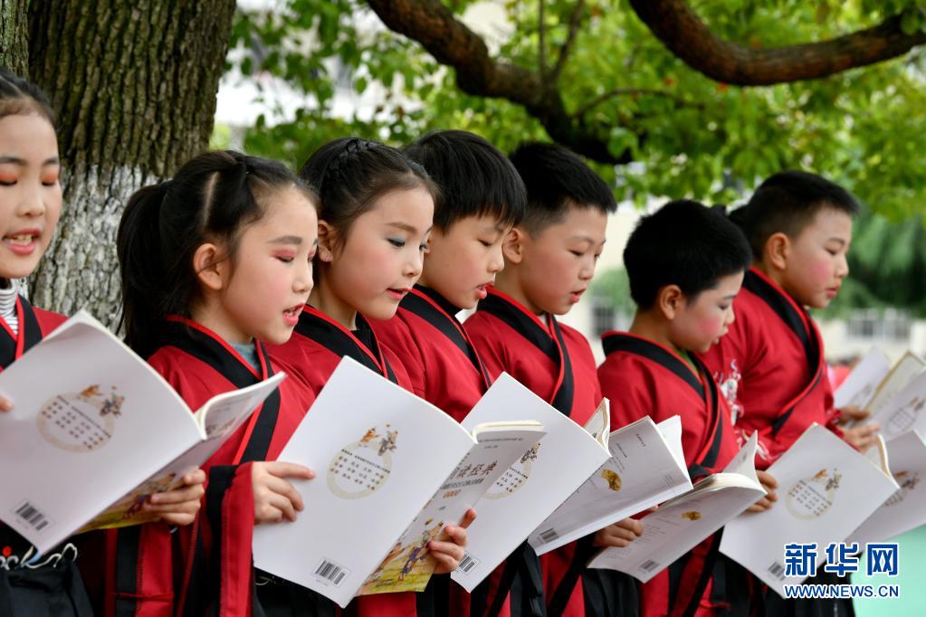 4月22日,湖北省襄阳市保康县实验小学学生在校园里的樟树下诵读国学经典。
