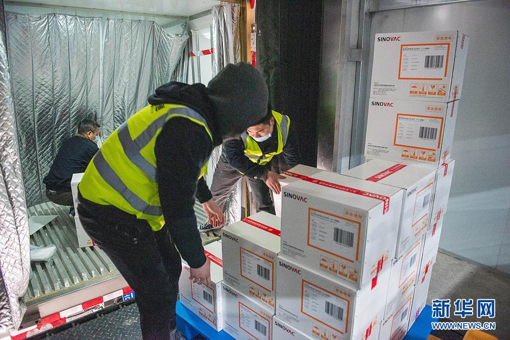 4月1日,北京科兴中维生物技术有限公司工作人员将发往海南的新冠疫苗克尔来福搬上冷链货车。新华社发(杨劲奕 摄)