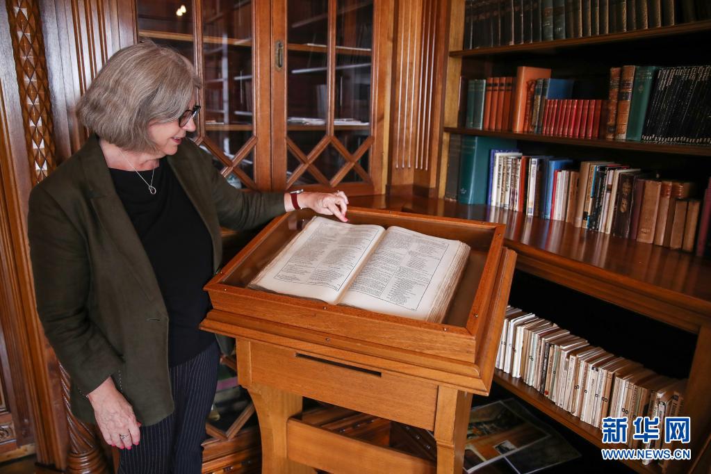 4月22日,澳大利亚新南威尔士州立图书馆馆长玛吉·巴顿向记者介绍莎士比亚藏书馆的初版莎士比亚著作。
