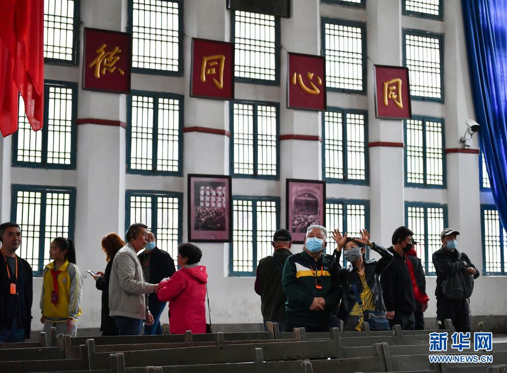 4月22日,参观者在杨家岭革命旧址中央大礼堂参观。
