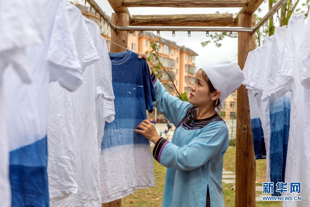 4月22日,工作人员在榕江县车民街道卧龙社区的民族产业工坊晾晒蓝染服饰。