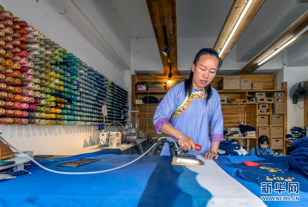 4月22日,工作人员在榕江县车民街道卧龙社区的民族产业工坊熨烫布料。