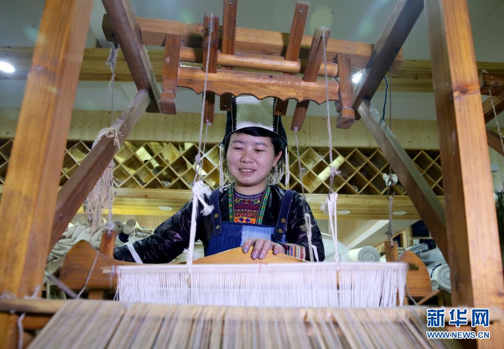 4月22日,工作人员在榕江县车民街道卧龙社区的民族产业工坊内用传统的手工艺织布。