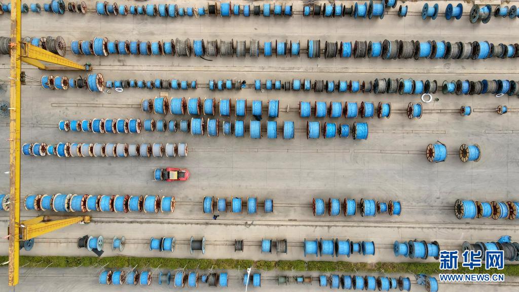 4月22日,工人在河北省宁晋县一家电线电缆生产企业内运输电缆(无人机照片)。