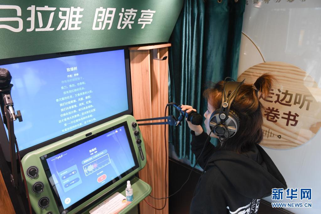 4月22日,顾客在书店朗读亭内选取内容进行录制,将音频分享给朋友。