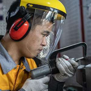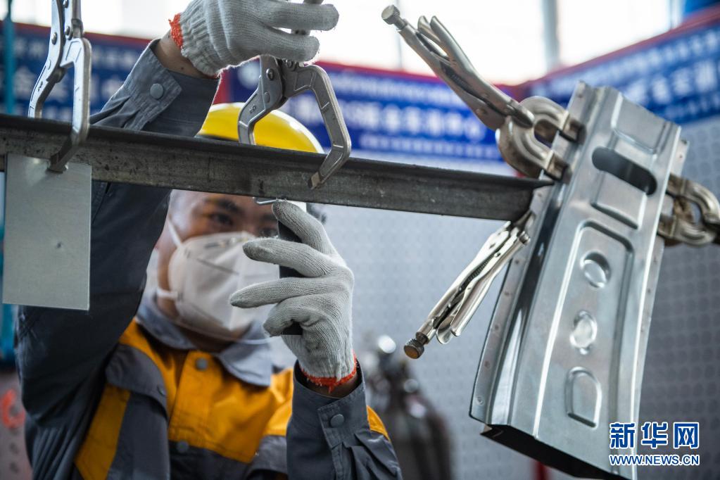 4月22日,参赛选手在车身修理——板件更换项目比赛中。