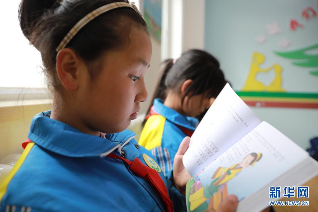 4月22日,在兰州新区第二小学,孩子们在翻阅新书。