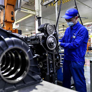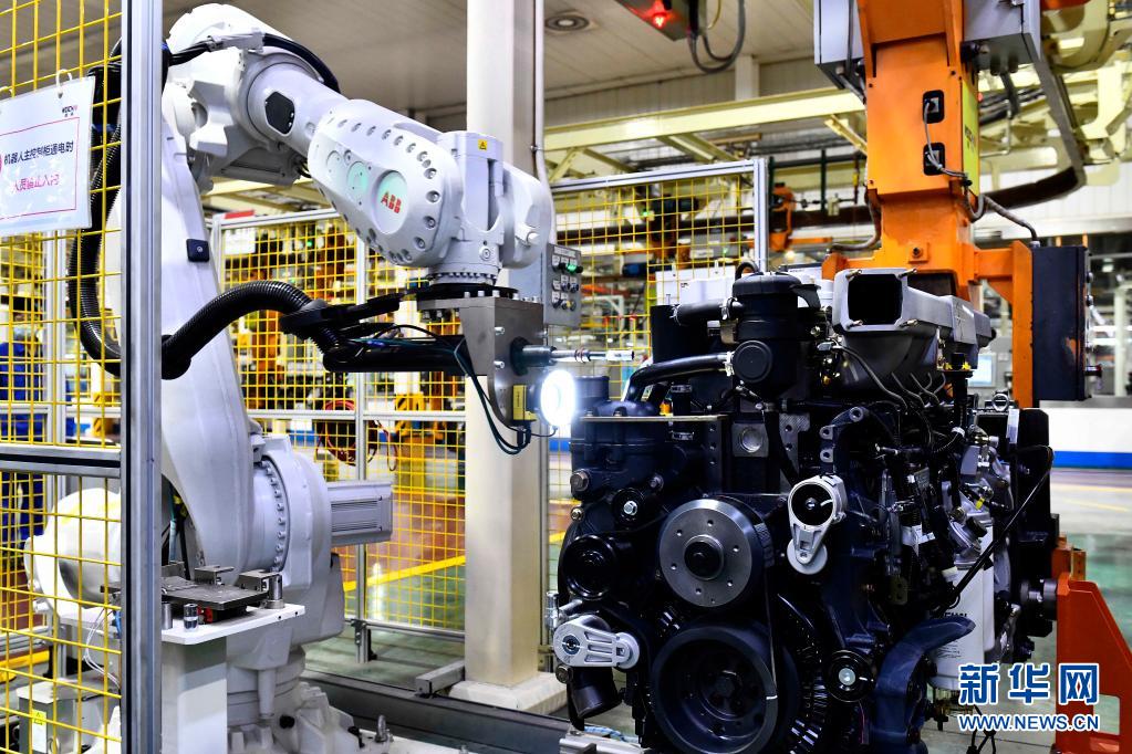 4月22日,在位于山东潍坊的潍柴集团总装车间,机器人在流水线上装配发动机。