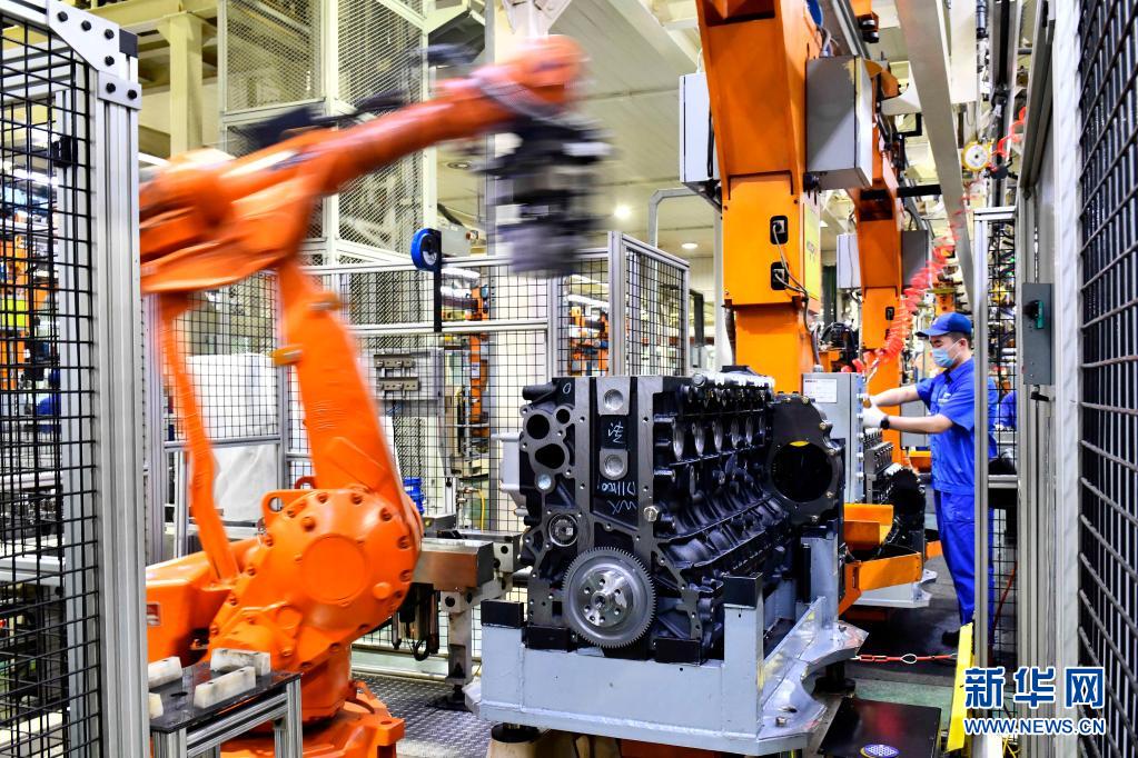 4月22日,在位于山东潍坊的潍柴集团总装车间,机器人在流水线上装配发动机。