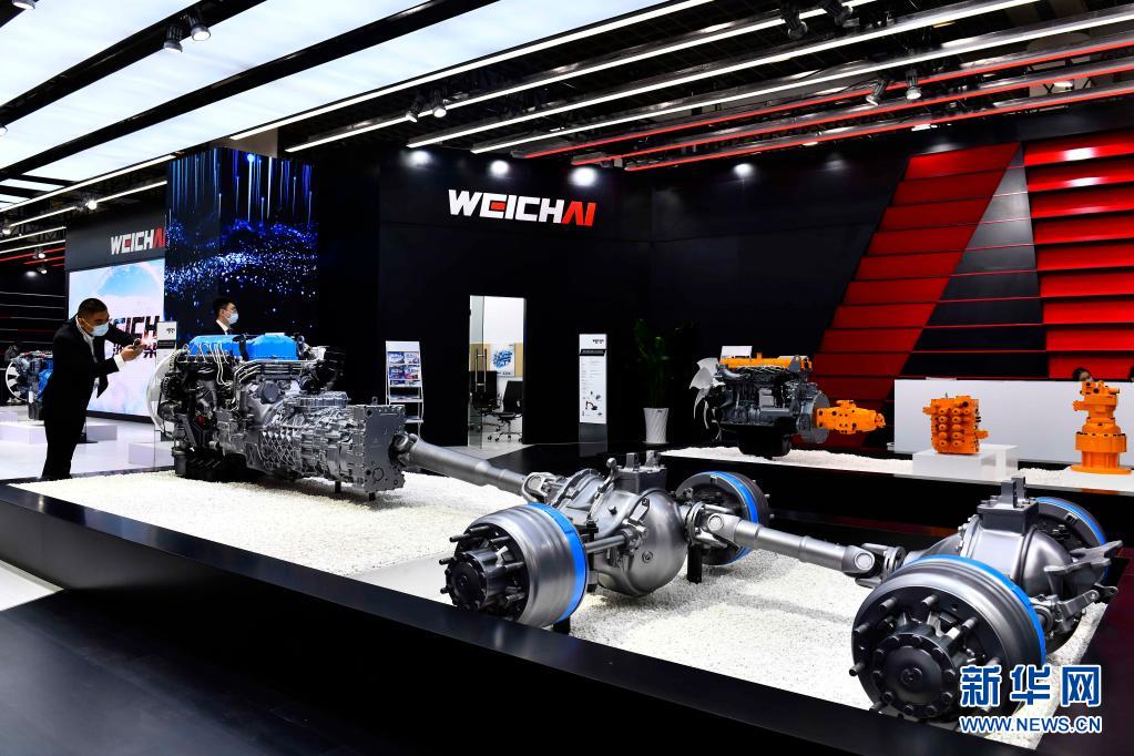 4月21日,在第二届世界内燃机大会上,与会嘉宾参观潍柴集团展示的发动机。
