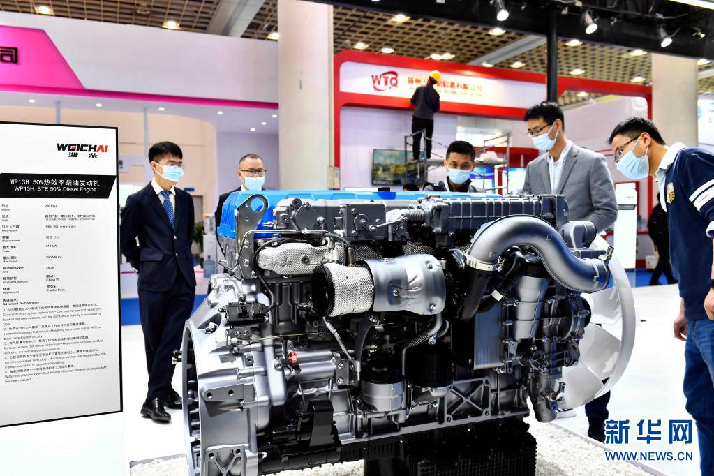 4月21日,在第二届世界内燃机大会上,与会嘉宾参观潍柴集团研发的50%热效率柴油机。