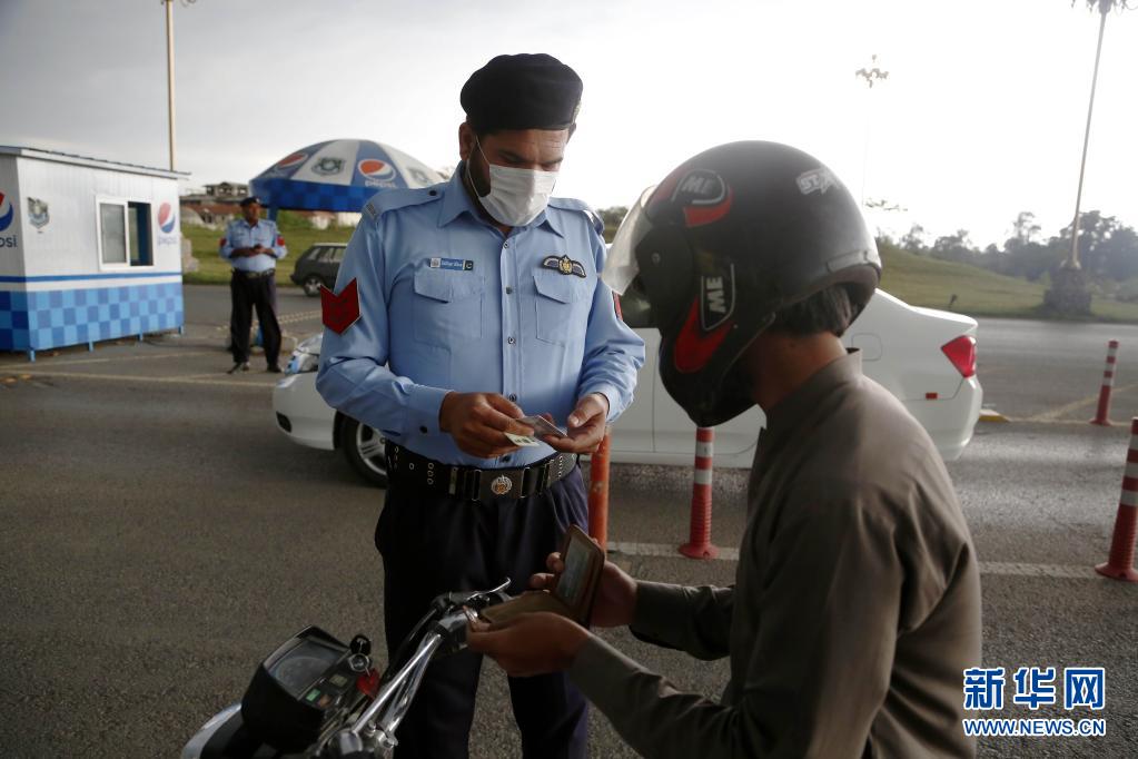 4月22日,警察在巴基斯坦伊斯兰堡一处检查点查看摩托车驾驶员证件。新华社发(艾哈迈德·卡迈勒摄)