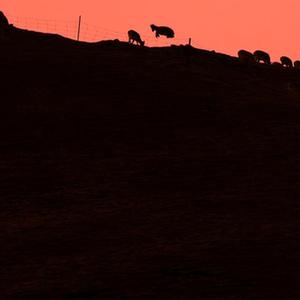 4月22日黄昏时分,在位于青海省海北藏族自治州的祁连山国家公园油葫芦保护分区,一头岩羊高高跃起跨越障碍。
