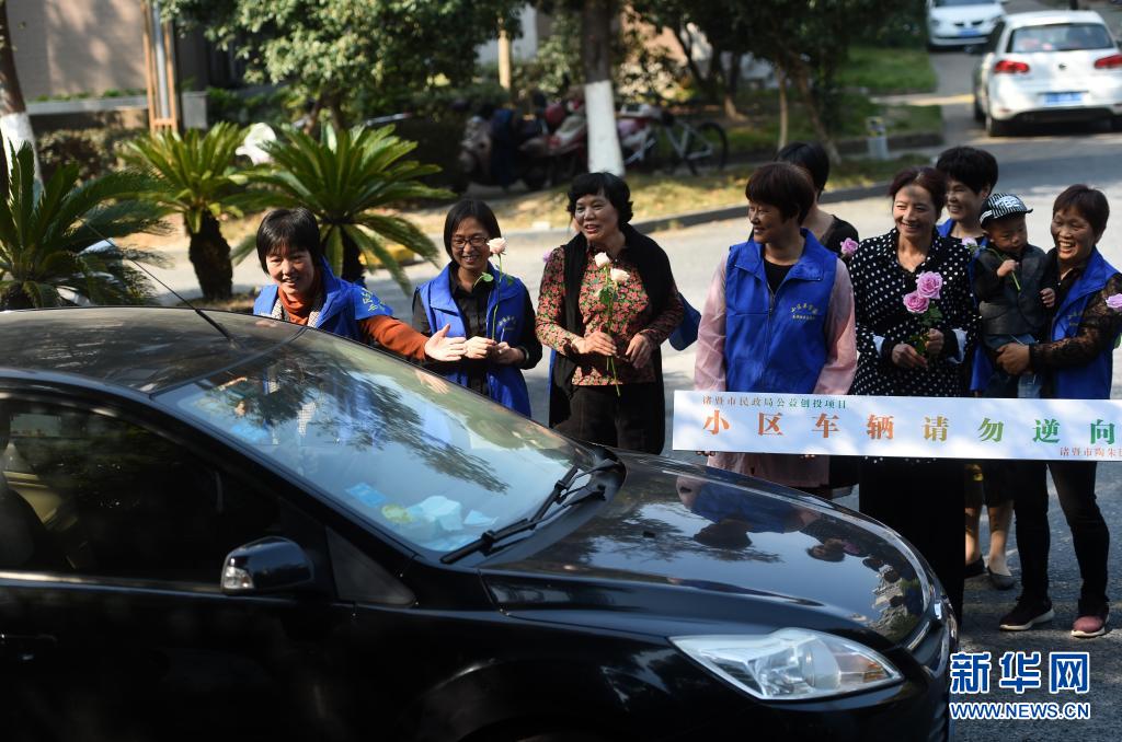 浙江省诸暨市陶朱街道友谊社区上海城小区内老年志愿者、小区“车管家”在引导车辆通行(2019年10月23日摄)。2019年7月起,诸暨市陶朱街道陶朱老年大学学员成立“陶朱老同志”志愿服务队,2000多名老年志愿者广泛参与社区基层治理。