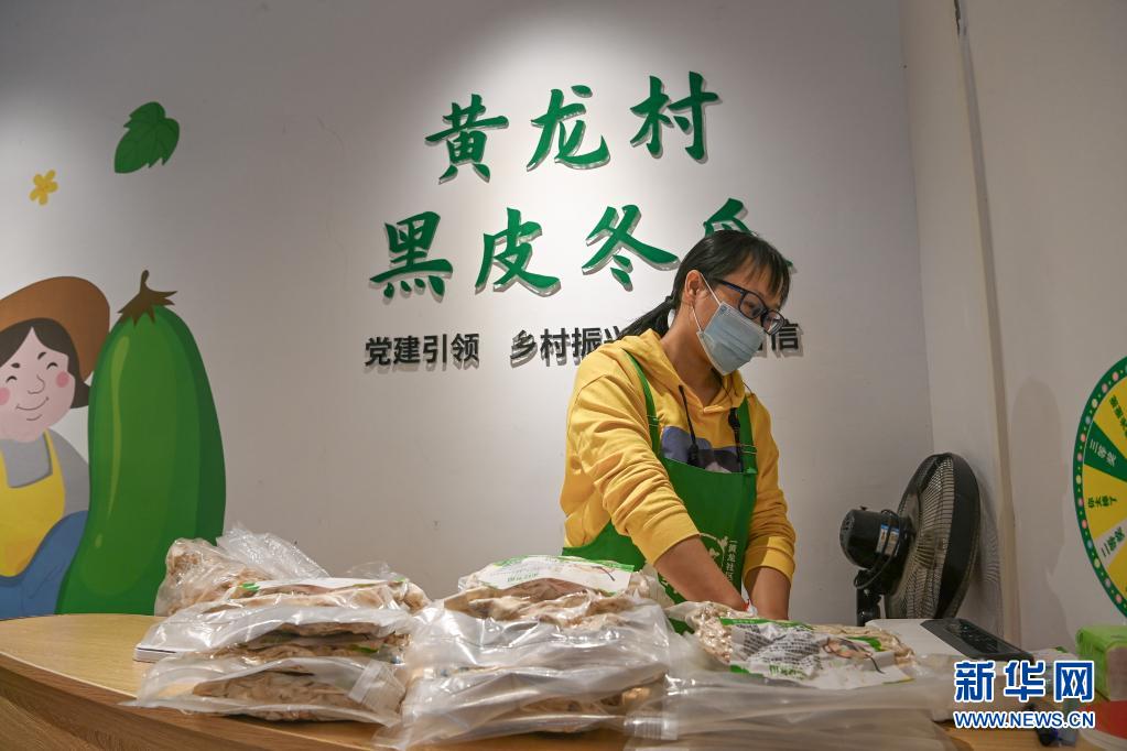 广东佛山顺德区黄龙村村民郭凤女在自己的黑皮冬瓜文创馆打包冬瓜干(2020年11月4日摄)。黄龙村以党建引领基层治理和乡村振兴,黄龙村党委牵头在全村创建40多个微创投项目,带动村民创业致富。