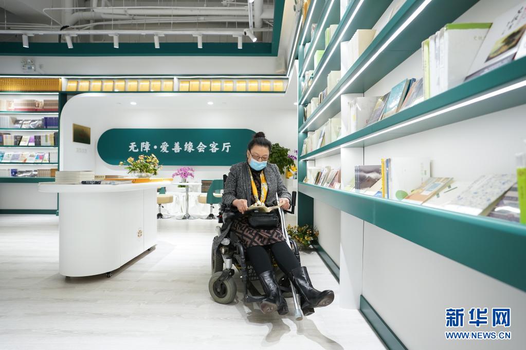 残障作家骆燕坐着轮椅在善缘书舍内翻阅图书(4月14日摄)。