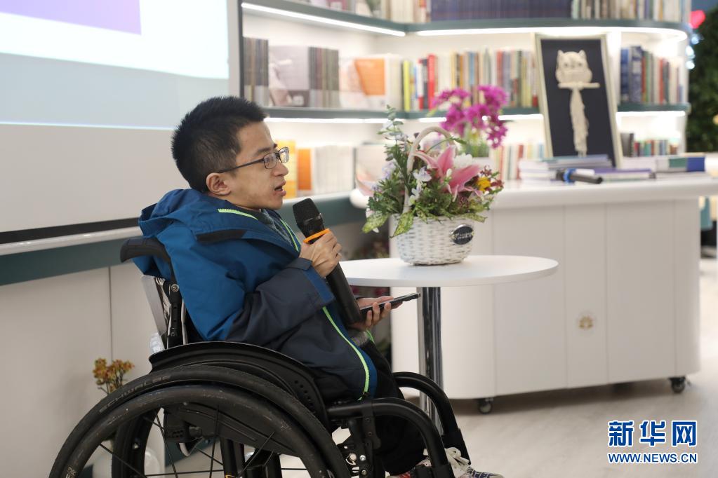 刘大铭在善缘书舍开业时分享自己的人生经历(3月18日摄)。刘大铭自幼罹患成骨不全症,只能蜷缩在轮椅上。在11次手术之后他生存下来,并赴英国攻读心理学。他将自己的经历写成《命运之上》一书。