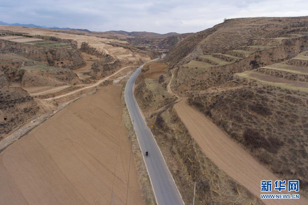 张宏帅骑行在去灵丘县古之河小学捐书的路上(4月21日摄,无人机照片)。