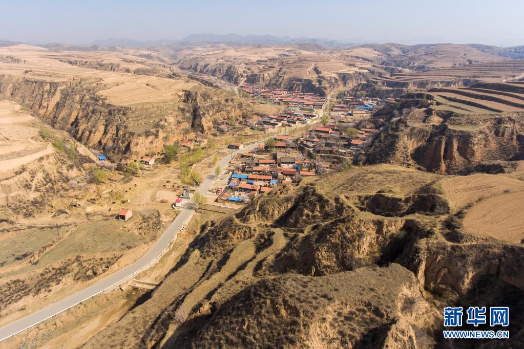 群山环抱的灵丘县东窖村(4月19日摄,无人机照片)。