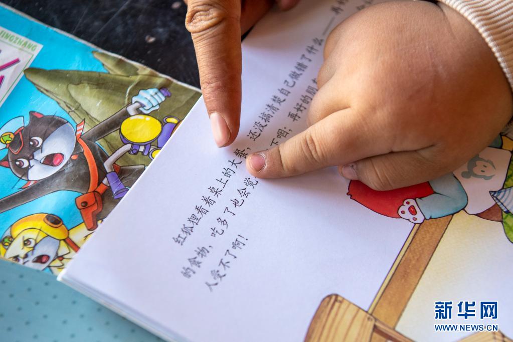 在灵丘县东窖村大学蜂乡村图书馆,张宏帅和小朋友一起读书(4月18日摄)。