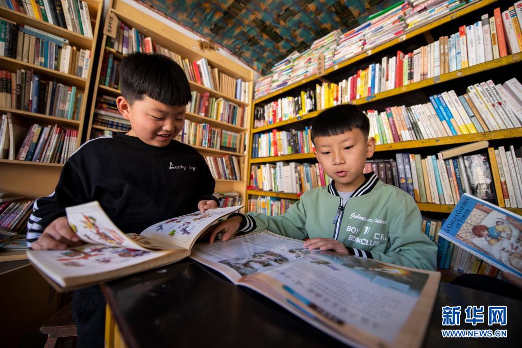 小朋友们在灵丘县东窖村大学蜂乡村图书馆内看书(4月18日摄)。