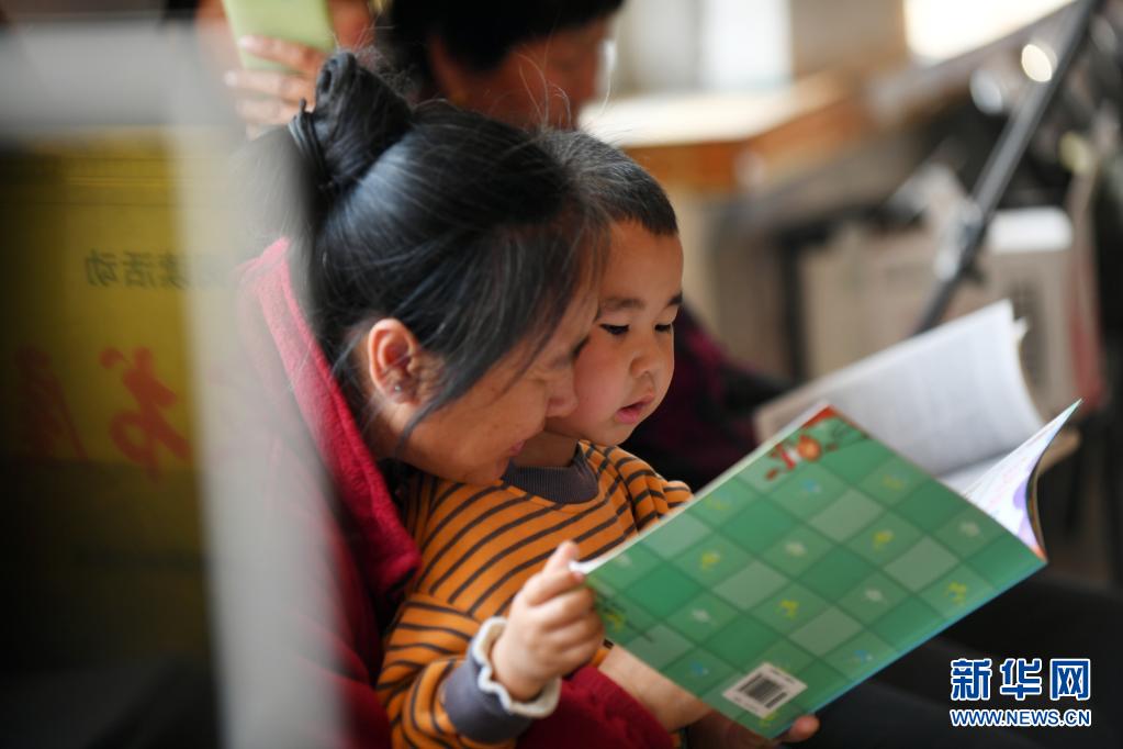 在吉林省扶余市肖家乡大沟村农家书屋,小朋友在家长陪护下阅读图书(4月21日摄)。