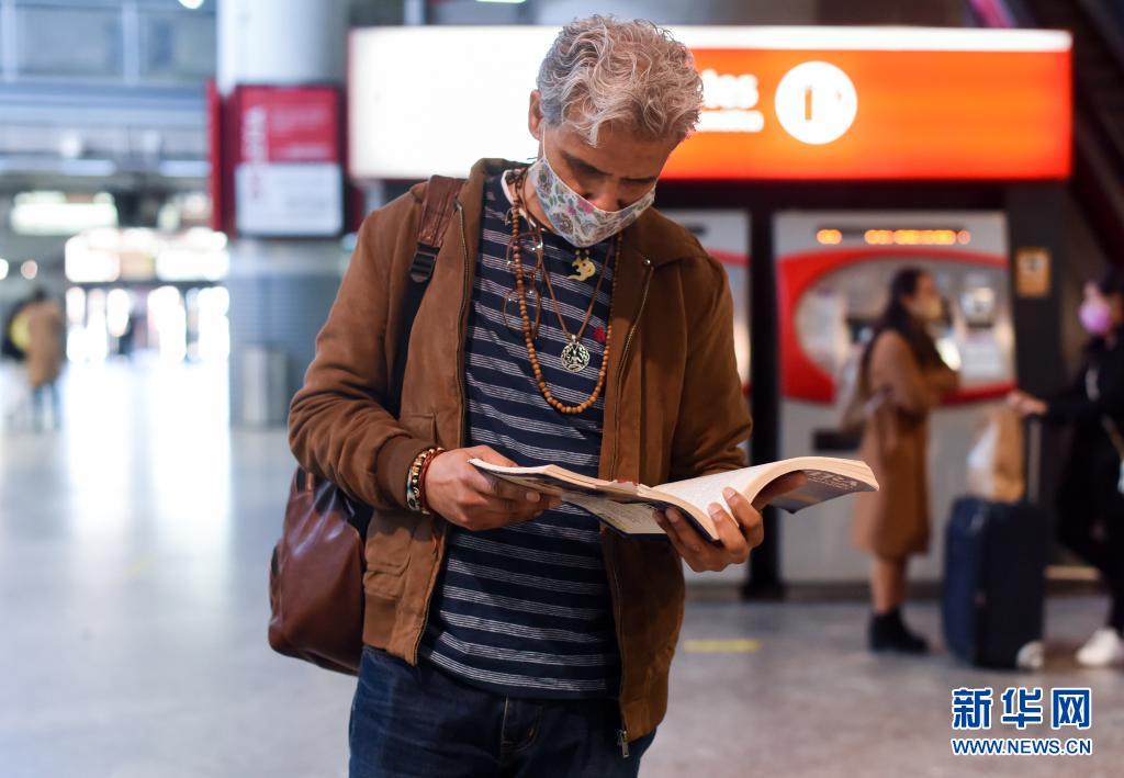 4月17日,一名男子在西班牙马德里一处车站内读书。
