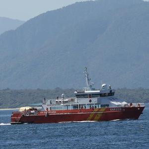 4月23日,在印度尼西亚东爪哇省外南梦,一艘搜救船驶离港口。