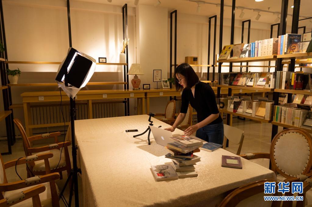 在哈尔滨何所有书店,于冰准备录制图书推荐短视频(2020年6月24日摄)。