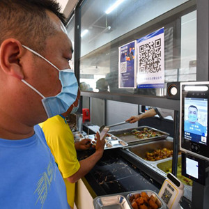 工人王贵富在“众智小城”餐厅刷脸点餐(4月22日摄)。