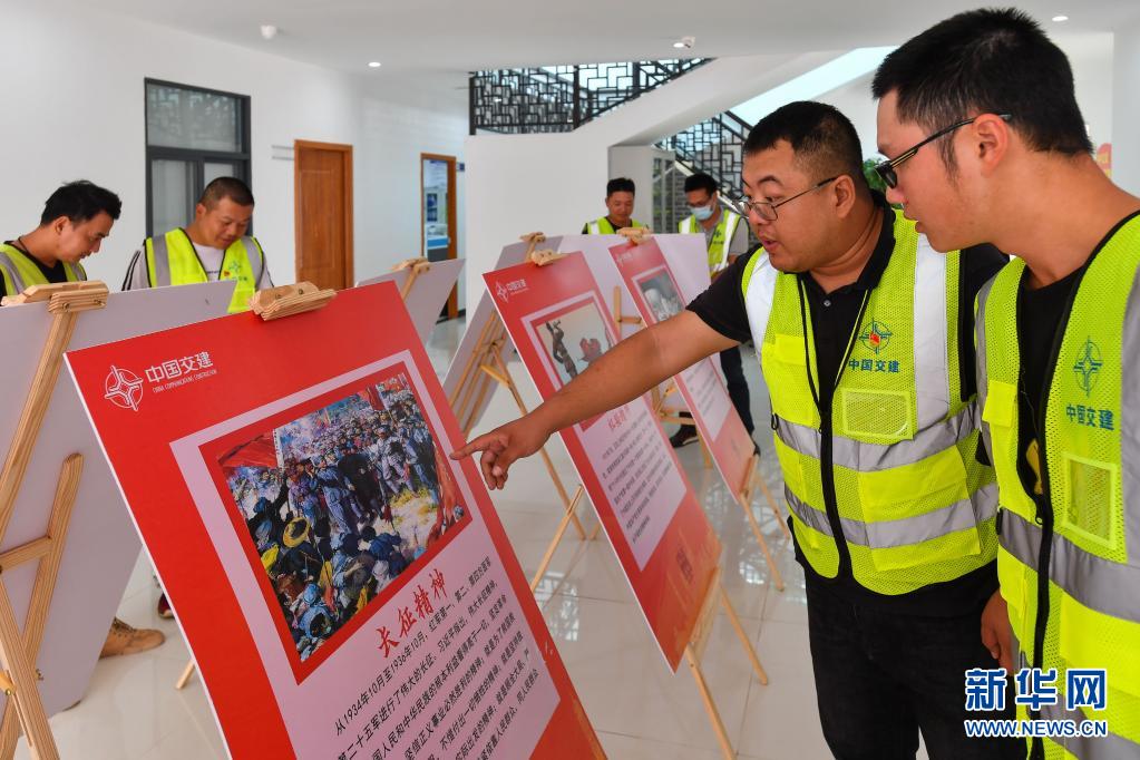 中交四航局横沥项目的员工在观看项目党支部设立的党史教育展板(4月22日摄)。
