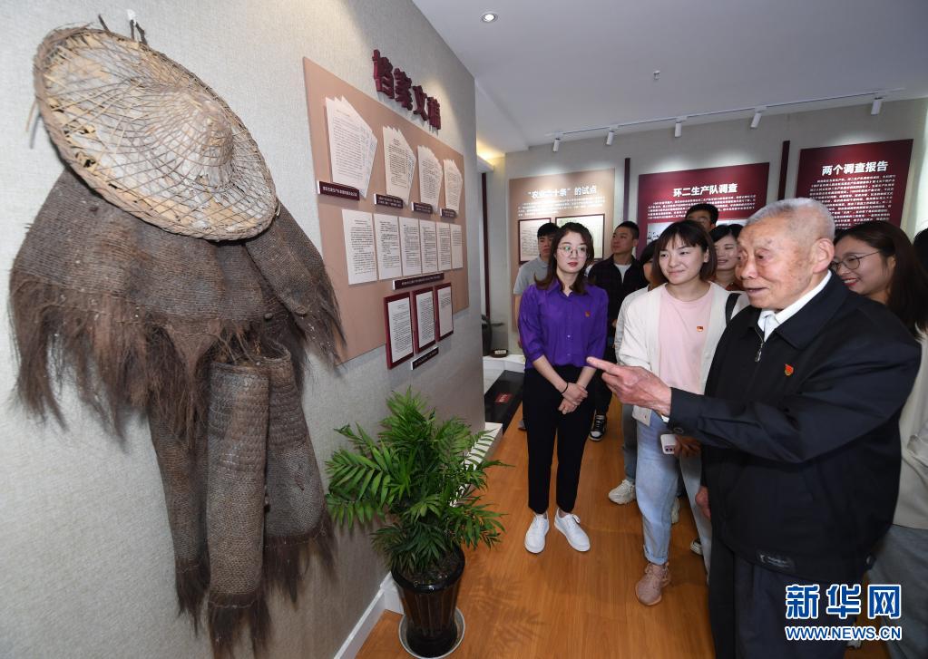 4月23日,青年党员们在东洲街道党群服务中心内的党史馆参加“一线话党史”活动,聆听有63年党龄的老党员陈如千(前右)介绍60多年前基层党员干部与村民一起开展劳动生产的情况。