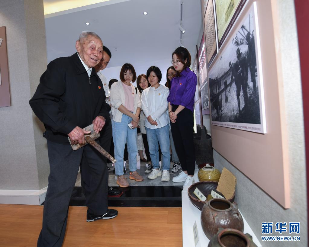 4月23日,青年党员们在东洲街道党群服务中心内的党史馆参加“一线话党史”活动,聆听有63年党龄的老党员陈如千(左一)介绍60多年前基层党员干部与村民一起开展劳动生产的情况。