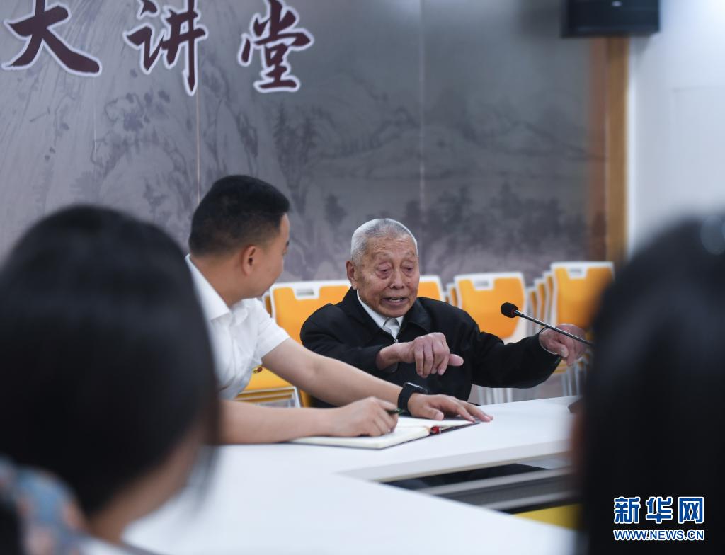 4月23日,青年党员们在东洲街道党群服务中心内的党史馆参加“一线话党史”活动,聆听有63年党龄的老党员陈如千(右)介绍60多年前基层党员干部开展调查研究的情况。