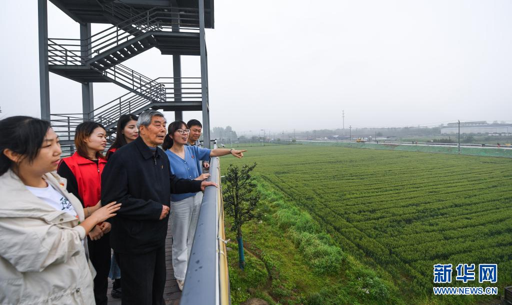 4月23日,青年党员们在红旗村的红旗田观景台上参加“一线话党史”活动,与有62年党龄、曾担任过生产大队长的老党员徐友金(右三)一起观看稻田作物的长势。