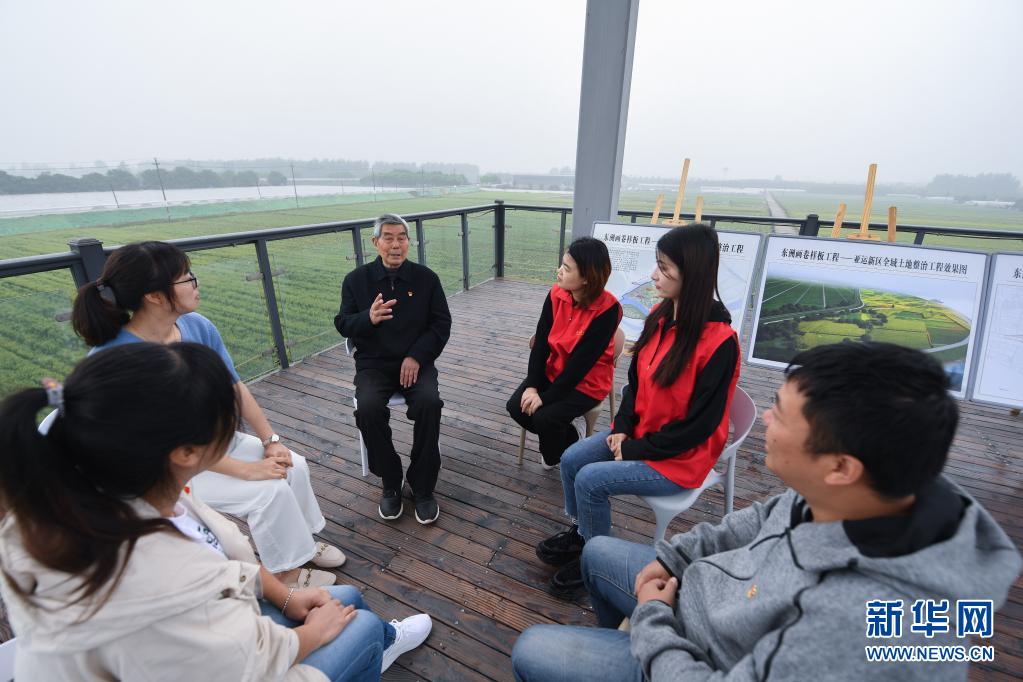 4月23日,青年党员们在红旗村的红旗田观景台上参加“一线话党史”活动,聆听有62年党龄、曾担任过生产大队长的老党员徐友金(左三)介绍村社历史。