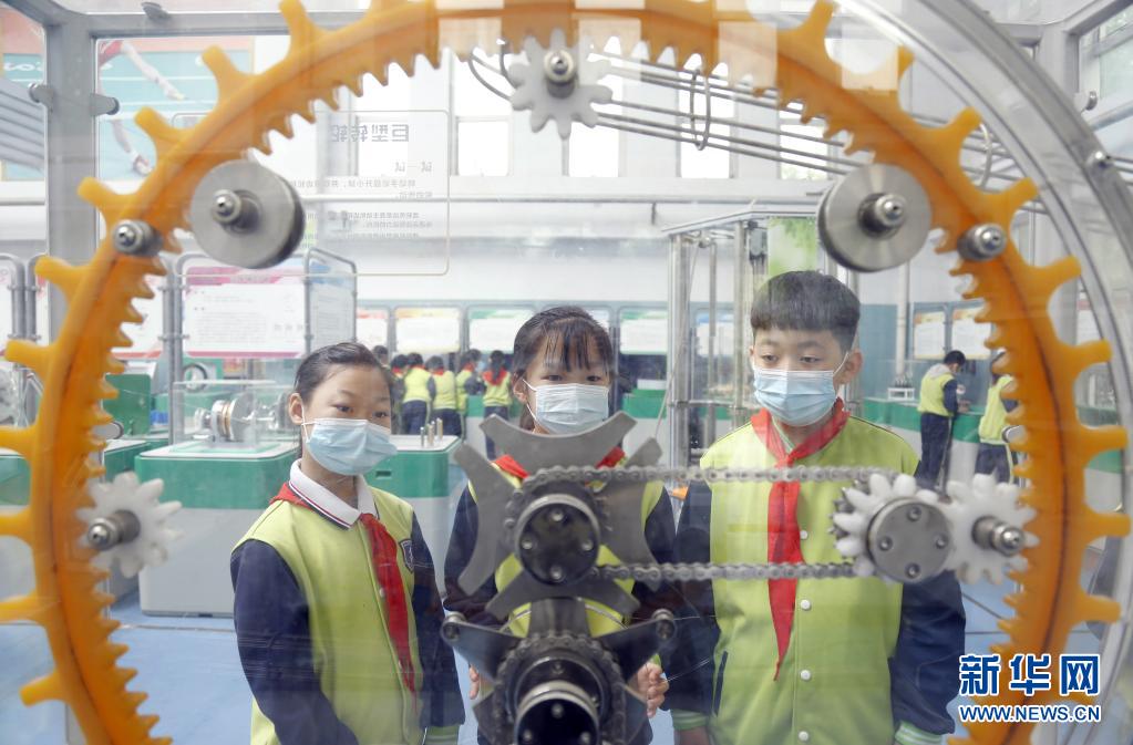 4月23日,学生在邢台市襄都区“流动科技馆”里体验“巨型转轮”。