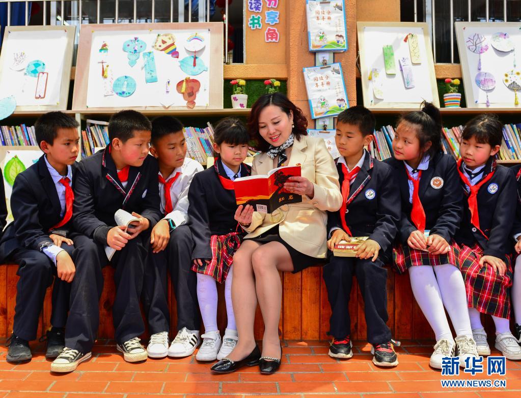 4月23日,在贵阳市云岩区野鸭小学举办的“阅读红色经典 致敬百年征程”读书日活动上,老师带领孩子们阅读。