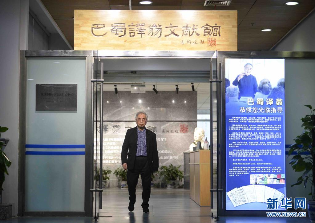 4月18日,杨武能在重庆图书馆“巴蜀译翁文献馆”内留影。馆中展示了杨武能的人生经历、手稿、信件和他著译的书籍。新华社记者 刘坤 摄
