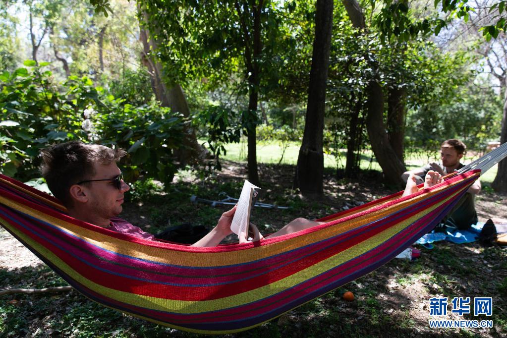 4月22日,一名男子在希腊雅典躺在吊床上阅读。