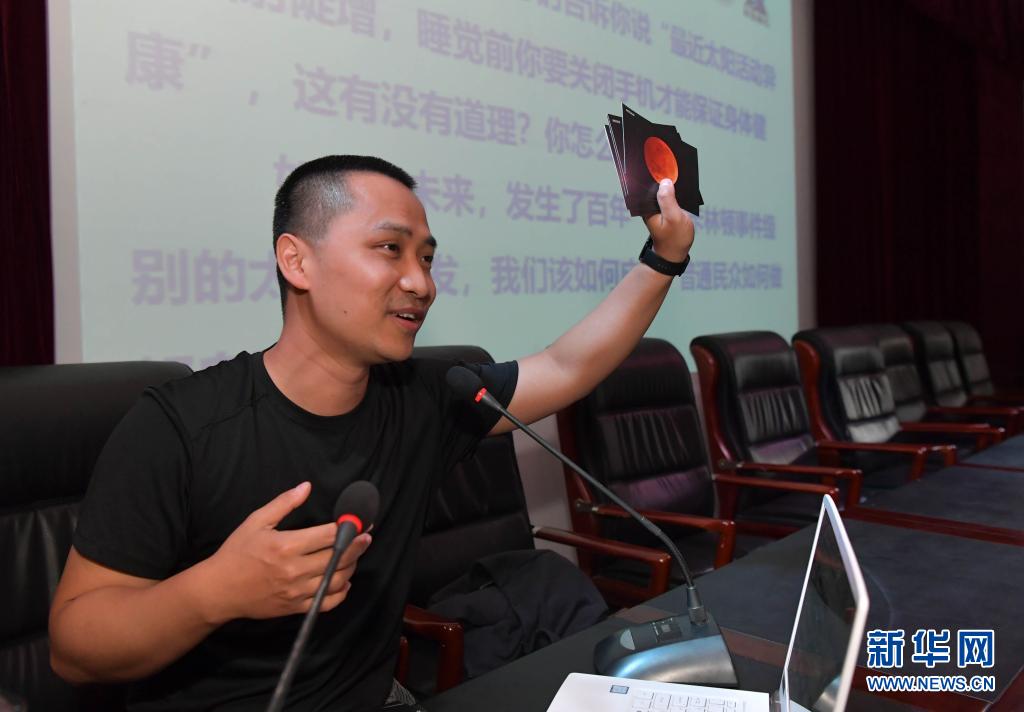 4月23日,在南昌市湾里管理局湾里一中,国家卫星气象中心、国家空间天气监测预警中心的工程师韩大洋向学生们展示月球照片。