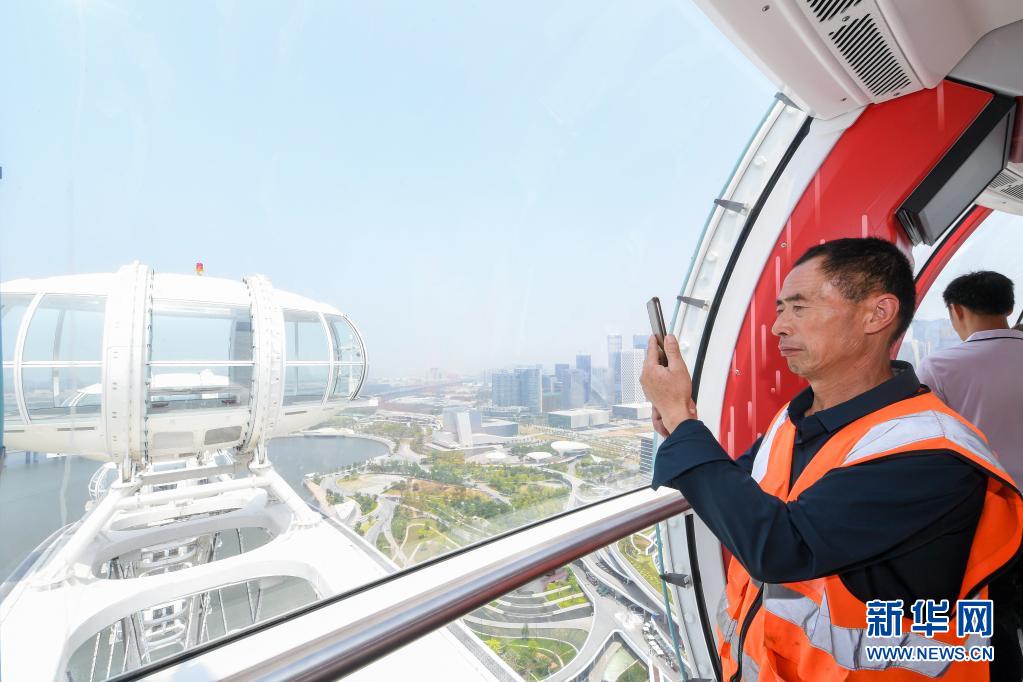4月23日,参与摩天轮所在公园建设的项目工人李长贵在摩天轮轿厢里拍摄风景。