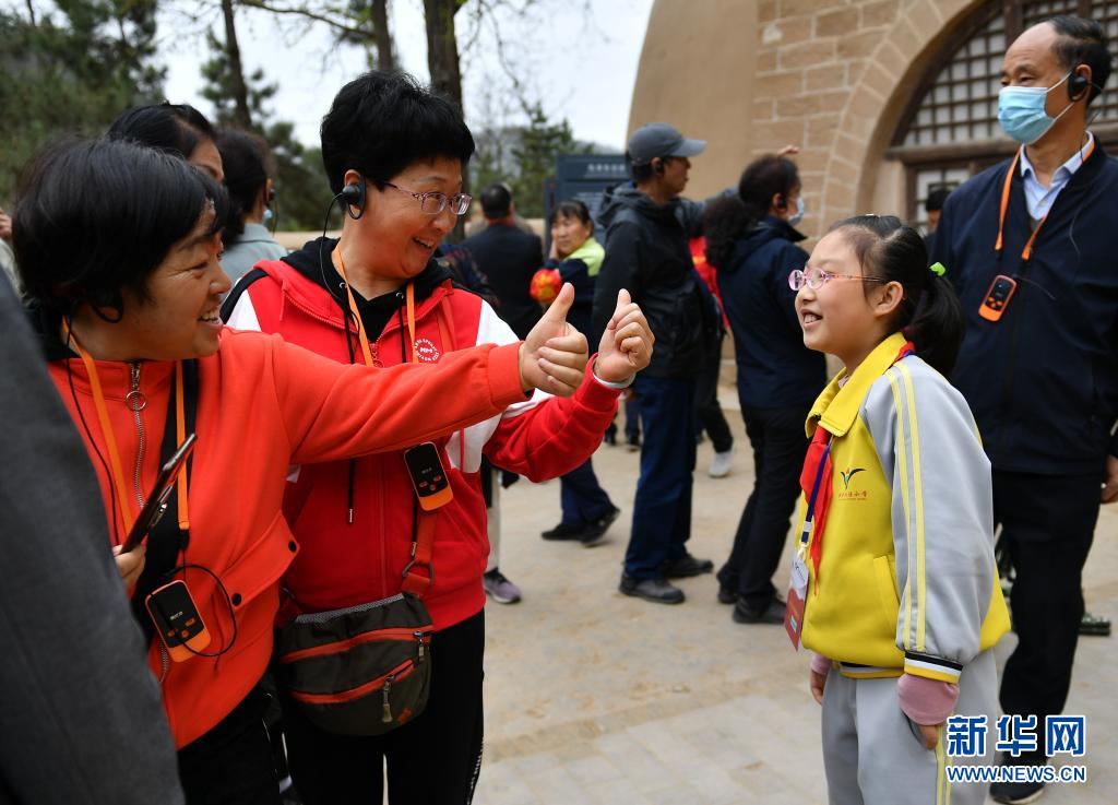 4月22日,在延安市杨家岭革命旧址,小讲解员毛雨昕(右二)与参观者交流。