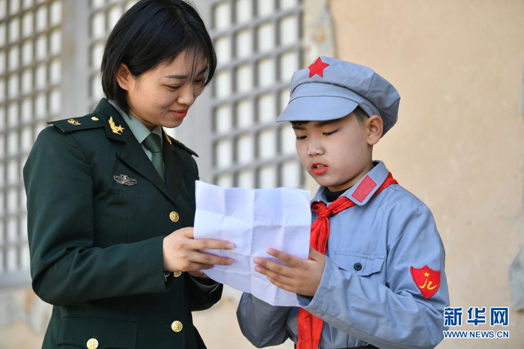 4月18日,在铜川市照金镇陈家坡会议旧址,小讲解员宋天翊(右)与陈家坡会议旧址讲解员交流讲解词。