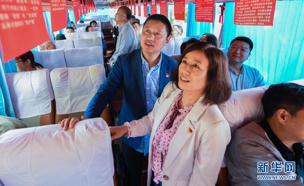 4月23日,参加党史教育的党员在前往目的地的红色旅游大巴上观看车内悬挂的红色教育资料。