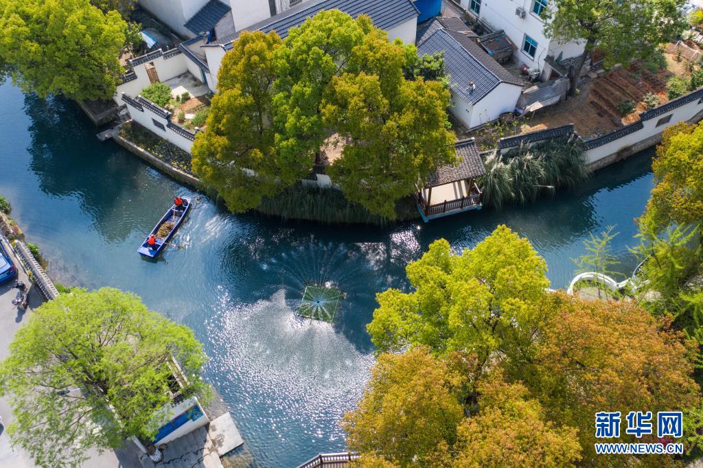 浙江省长兴县龙山街道渚山村,保洁人员进行日常河道护理巡查(2020年4月9日摄,无人机照片)。新华社记者 徐昱 摄