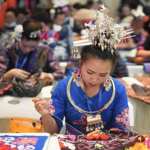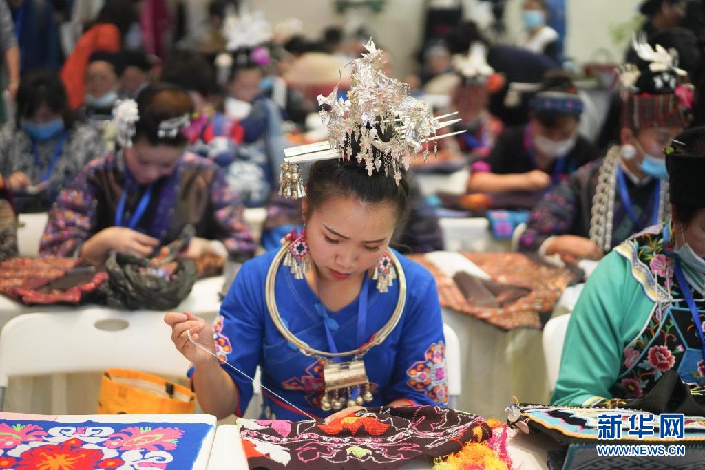 当日,2021年贵阳妇女特色手工技能及创新产品大赛在贵州省博物馆多功能厅开赛。此次大赛以“巾帼行动、匠心圆梦”为主题,集中展现了贵阳市实施“锦绣计划”传承中华优秀传统文化、促进贵阳市妇女创业就业的成果。34名选手展示刺绣、蜡染、银饰等技艺,打造一场指尖上的艺术盛宴。新华社发(张晖 摄)